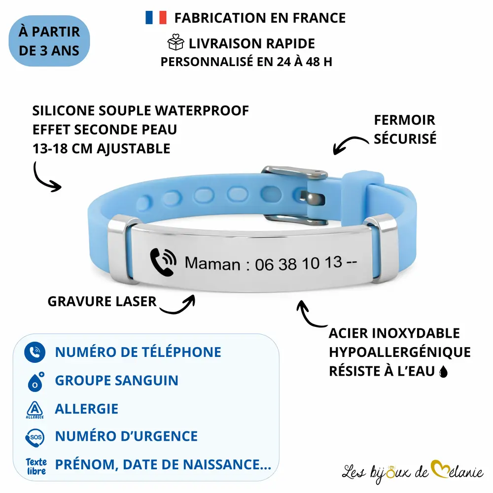 - Personnalisation complète : Gravez votre numéro de téléphone, le prénom de votre enfant, son groupe sanguin, ses allergies connues ou encore un numéro d’urgence. La gravure laser est nette, lisible et durable.