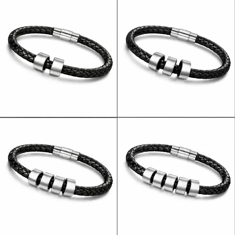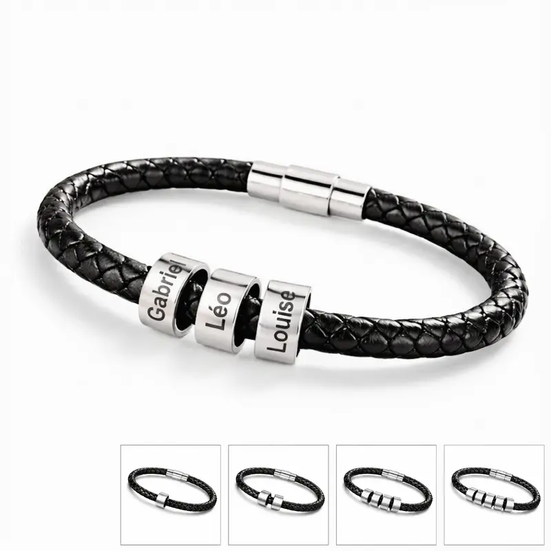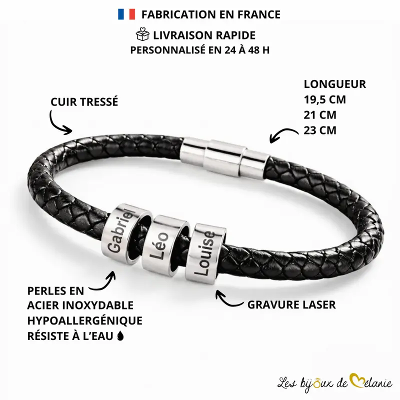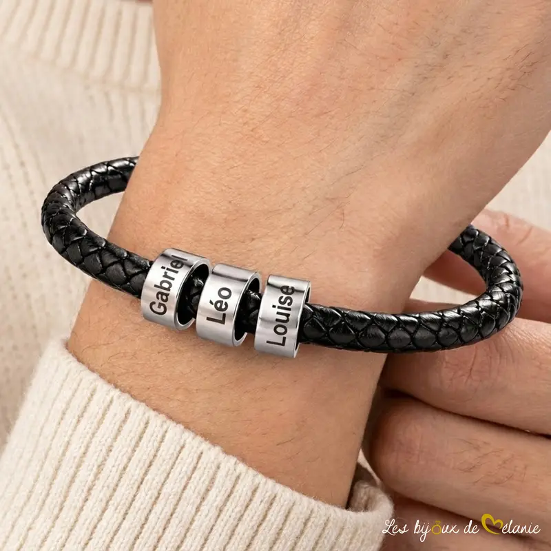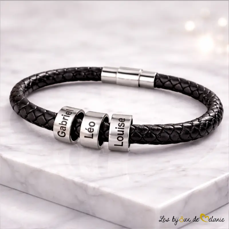 Offrez-vous un bracelet homme personnalisé en cuir noir, élégant et intemporel. Personnalisation possible avec 1 à 5 prénoms gravés sur perles en acier inoxydable. Disponible en 3 tailles (19,5 – 21 – 23 cm) avec fermoir magnétique sécurisé. Un cadeau personnalisé idéal pour papa, la famille ou un homme qui compte. Fabrication artisanale et expédition sous 24–48 h.