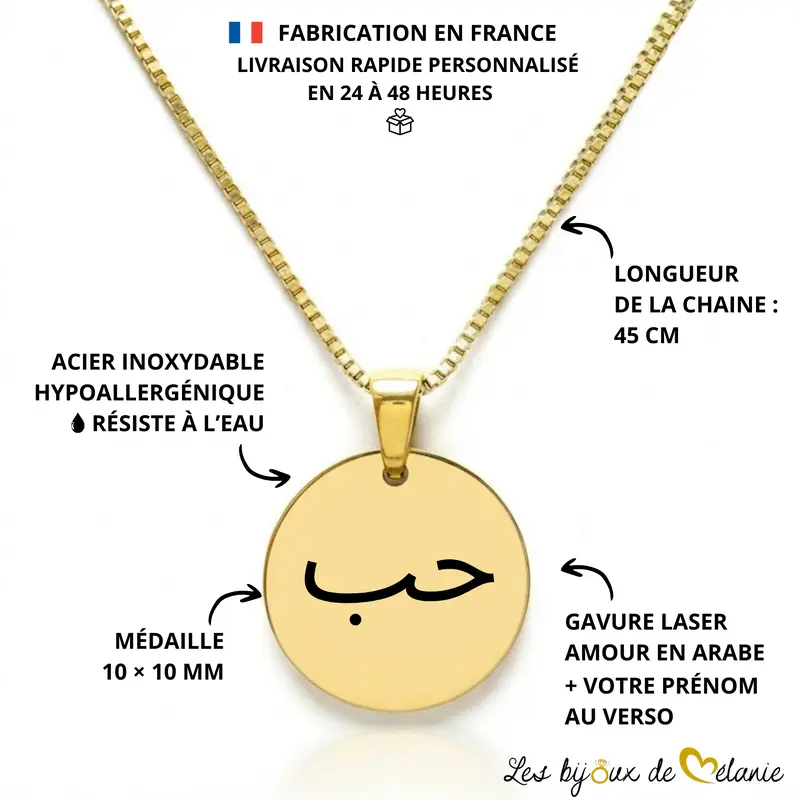 Ce collier amour arabe en est l’exemple parfait. Nous avons gravé le mot « Hob » (حب), qui signifie amour en arabe, sur une médaille fine et élégante. Un mot simple. Pourtant, un mot universel. Un mot puissant.
