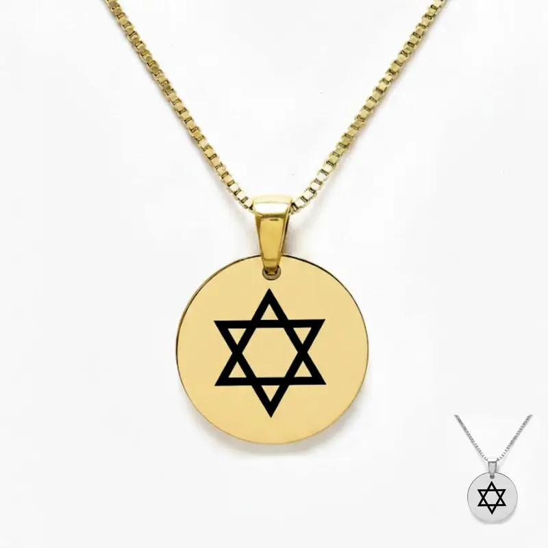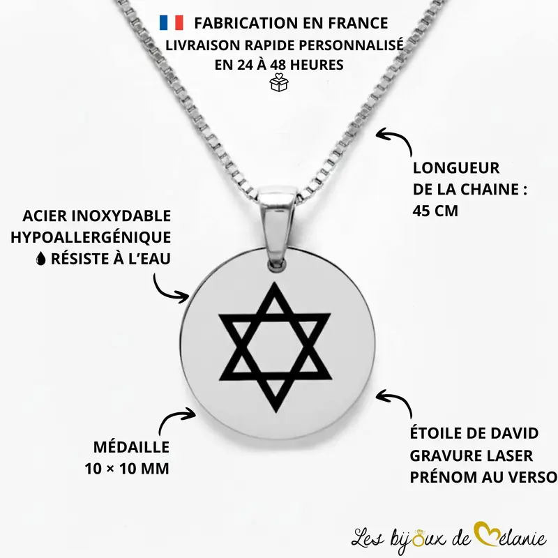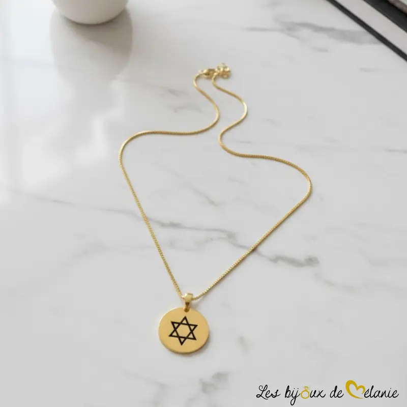 Découvrez notre collier Étoile de David personnalisé dans notre atelier français. Un bijou spirituel en acier inoxydable, gravé recto-verso pour une qualité inaltérable. Expédition rapide 24/48h. Offrez un symbole de foi et de protection unique et durable.