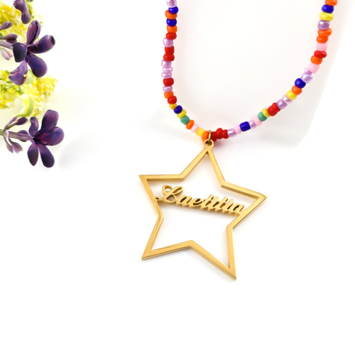 Rendez exceptionnel ce sublime collier étoile personnalisé prénom ! Ajoutez-y votre prénom ou bien le prénom d’une personne chère à votre coeur. Laissez-vous séduire par ce bijou original, en forme d’étoile en acier inoxydable de qualité, découpé et travaillé de manière artisanale, ce qui le rend encore plus personnel. Une jolie création accompagnée d’un joli collier en perles multicolores. Créez pour vous, ou bien pour offrir, un joli bijou personnalisé unique, qui saura séduire aussi bien les petits que les grands. Pour Noël, un anniversaire, un baptême ou tout autre occasion. Soyez sûr de faire plaisir à vos proches en leur créant un bijou sur mesure avec ce sublime collier étoile personnalisé prénom. Un cadeau personnalisé reste un souvenir inoubliable, qui touchera le coeur de la personne à qui vous allez l’offrir.