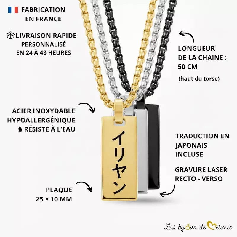 Double gravure laser : Collier Prénom Japonais Personnalisé sur les deux faces