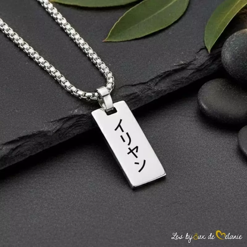 Pour les fans de la culture nippone, de l’art japonais et de l’univers des mangas, nous vous proposons ce collier prénom japonais personnalisé. Gravé dans notre atelier en France, nous nous chargeons pour vous de la traduction ! En acier inoxydable hypoallergénique, découvrez notre pendentif gravé avec prénom japonais.