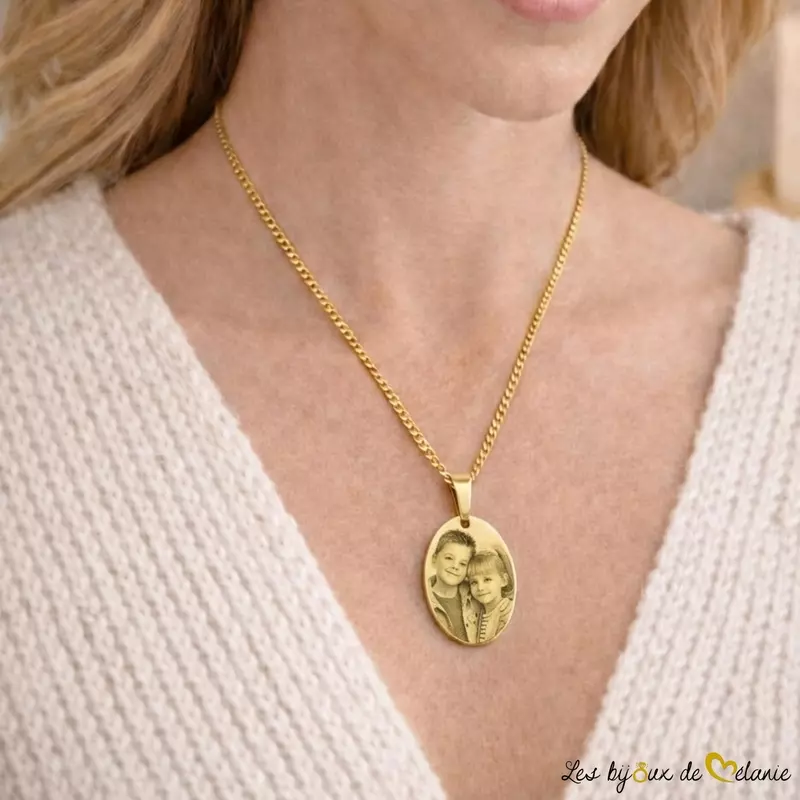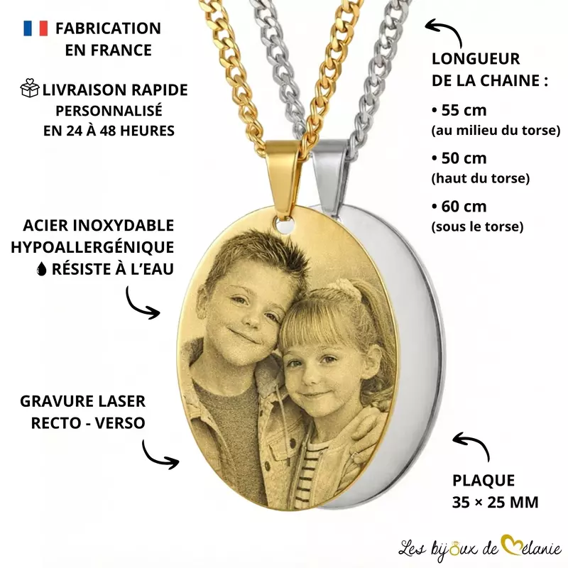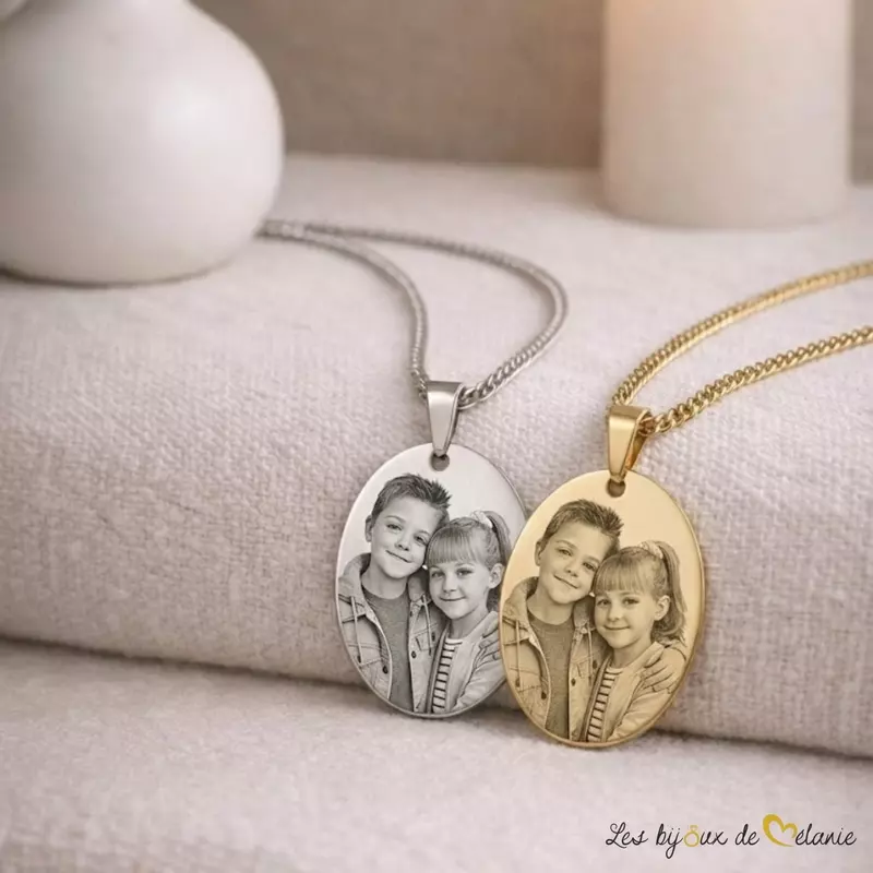 Pendentif photo personnalisé gravé au laser, en acier inoxydable 316L. Un bijou photo durable et élégant, fabriqué et personnalisé en France sous 24 à 48 h.